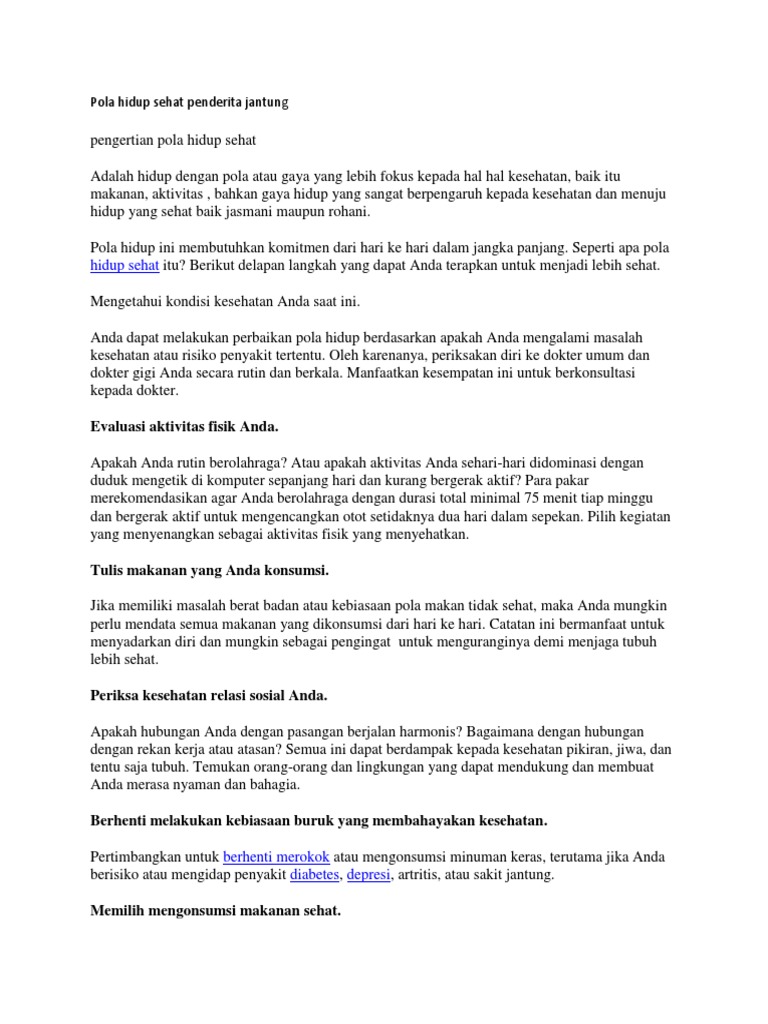 Berikut beberapa tips gaya hidup yang bisa diterapkan untuk kesehatan jantung anda. Gaya hidup merupakan kata lain dari life style, yang didefinisikan sebagai bagian dari kebutuhan sekunder manusia yang bisa derubah sesuai zaman atau keinginan seseorang untuk berubah gaya hidupnya. Gaya hidup sering digambarkan dengan kegiatan, minat dan opini dari seseorang (activities, interests, and opinions). Info dan tips trik gaya hidup sehat untuk tampil sehat, bugar dan dengan tubuh yang.