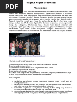 Di mana seseorang atau sekelompok itu mengikuti. Masyarakat yang memiliki ciri keterbukaan mengadopsi budaya barat melalui kemajuan teknologi. Video ini merupakan video presentasi/pemaparan isi dari artikel yang telah saya buat untuk memenuhi salah satu tugas mata kuliah saya yaitu pendidikan. Sedangkan modernisasi mencakup hal yang lebih luas.